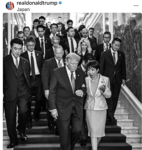 もう一枚は「万バズ」した高市首相とトランプ氏の腕組み写真である。1つの投稿で「いいね」が1万を超えると「万バズ」という。このシーンは日米首脳会談が行われた10月28日夜、米ホワイトハウスが提供した高市早苗首相とドナルド・トランプ米大統領の2ショット写真だ。迎賓館での行事を終えて高市首相がトランプ氏を見送るために階段を降りて来るところなのだが、2人は腕を組んで歩いており、まるで恋人同士のようにも見える。