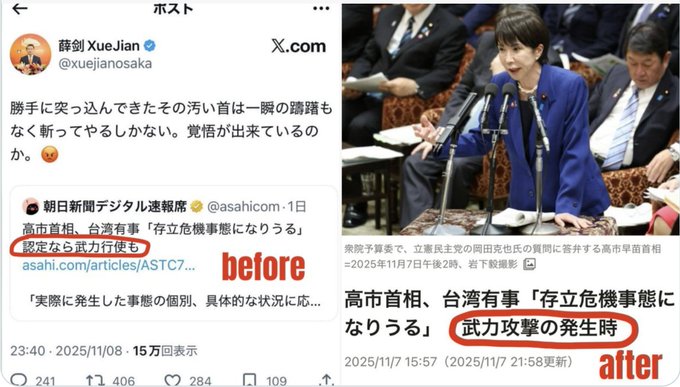 朝日が7日の衆院予算委員会での首相の答弁を受けて同日午後4時前に配信した初報の見出しは「高市首相、台湾有事『存立危機事態になりうる』 認定なら武力行使も」とある。これだと、日本側が先制攻撃を示唆するかのようにもとられかねない。事実、中国の薛剣駐大阪総領事はこれに反応してゲスな投稿(写真左)をした。