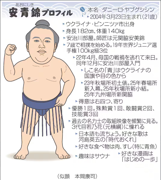 大相撲九州場所千秋楽でウクライナ出身の関脇安青錦=本名ダニーロ・ヤブグシシン、安治川部屋=が初優勝した。