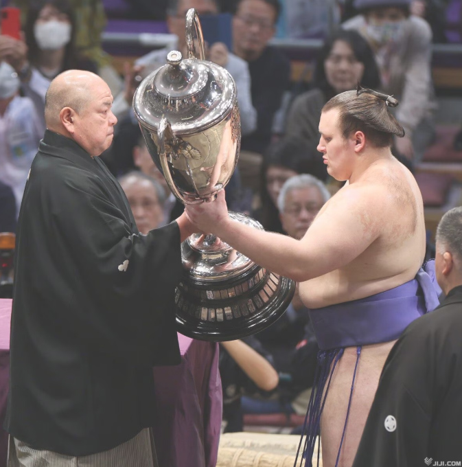 から賜杯を受け取る安青錦=23日、福岡国際センター.jpg)