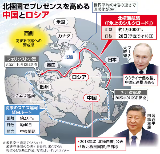 厚い氷が覆う北極だが温暖化に伴って海氷の融解が進んだ結果、航路として利用できる可能性が増している。北極海航路を活用すれば、スエズ運河や喜望峰を経由する「南回り航路」より、アジアと欧州をおよそ半分の短期間で行き来できる。イエメンの親イラン武装組織フーシ派が紅海で商船への攻撃を展開し、海運業界には南回りを避ける動きがあることも北極圏への関心を後押しする。