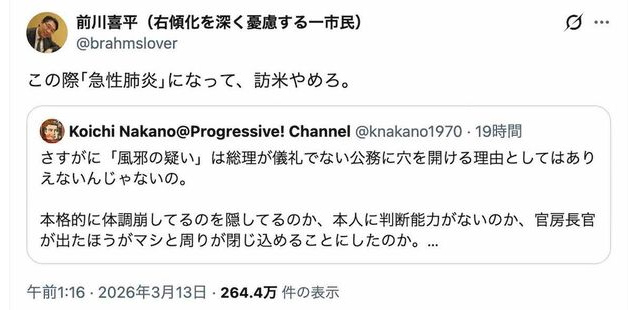 この静養に対し、耳を疑うような暴言を放ったのが、文部科学事務次官を歴任した元官僚の前川喜平で、12日、自身のX(旧ツイッター)で次のように綴った。