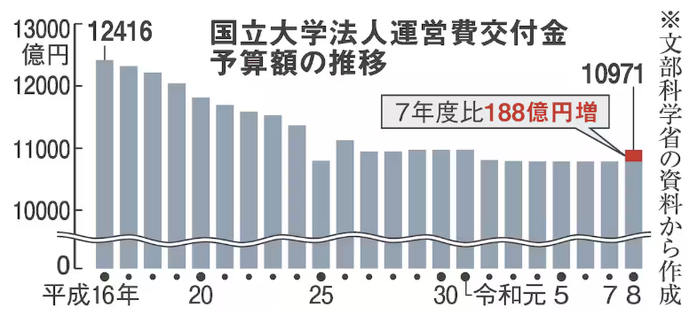 大学に研究に必要な「ムダ」な部分に、一般企業の「ムダ排除」を当てはめた結果、大いなる不振に陥った失策である。馬鹿げた制度は大蔵省(財務省)時代から始まったからもう22年になる。毎年1%減なら単純に比較すれば当時の予算の4分の3になっている。国立大学が疲弊するわけである。